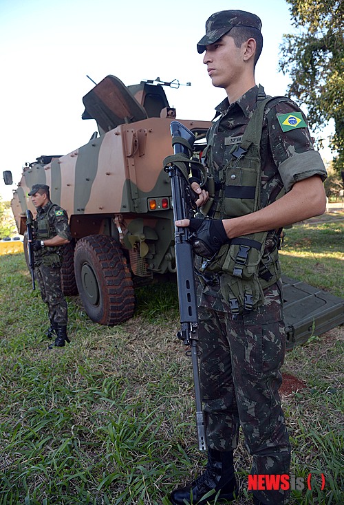 【이구아수(브라질)=뉴시스】박영태 기자 = 13일 오전(한국시각) 2014브라질 월드컵에 출전하는 축구국가대표팀 브라질월드컵 베이스캠프인 브라질 포즈 두 이구아수의 플라멩고 스타디움 주변을 군인들이 장갑차를 세우고 경계근무를 서고 있다.