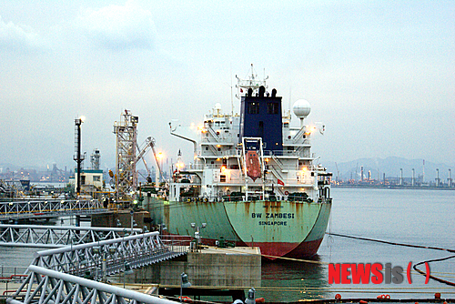 【여수=뉴시스】김석훈 기자 = 13일 오전 전남 여수시 낙포각 GS칼텍스 원유두부에서 미국 텍사스산 콘덴세이트(초경질 원유) 40만 배럴을 실은 싱가포르 국적 원유수송선 ‘BW 잠베시’가 원유를 하역하고 있다.