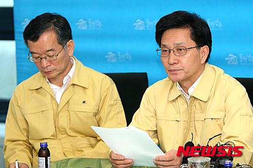 【강릉=뉴시스】김경목 기자 = 최명희 강원 강릉시장이 26일 오전 강릉시청 프레스센터에서 강릉시의회 내무복지위원회 위원들(조영돈·허병관·강희문·유현민·조대영·최익순)과 이용기 의장, 최선근 부의장, 김명남 보건소장, 강석호 보건정책과장 등 30명이 자가 격리된 데 대해 브리핑을 하고 있다. 2015.06.26.