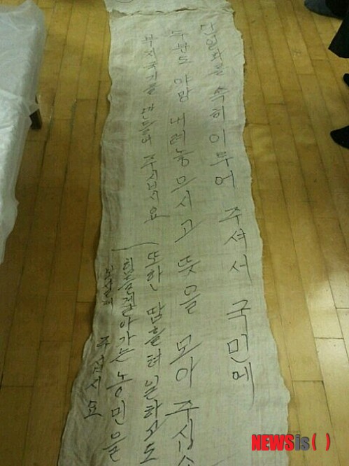 【완주=뉴시스】권철암 기자 = 22일 오후 5시10분께 전북 완주 모 아파트 13층에서 유모(52)씨가 문재인-안철수 후보 단일화를 촉구하며 투신하기 전 남긴 메시지가 삼베에 적혀있다. 이 삼베에는 "두 후보님께 드립니다.