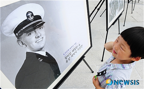 【서울=뉴시스】팽현준 기자 = 22일 오후 서울 은평구 녹번동 은평 평화공원에서 은평구가 주최한 美 해군 윌리엄 해밀턴 쇼 대위의 동상 제막식 자리에 열린 사진전을 한 어린이가 보고 있다.