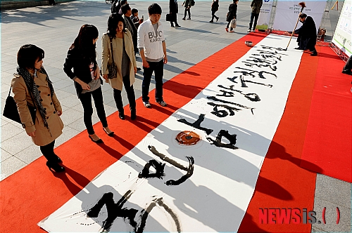 【서울=뉴시스】박문호 기자 = 31일 오전 용산구 한강로 용산역 광장에서 국가암정보센터'의 국민 암예방 수칙 실천'을 위한 퍼포먼스로 서예가 도정 권상호 선생이 길이 10m의 천에 '국민 암예방 수칙 실천을 다짐합니다"라는 글귀를 쓰고 있다. 국가암정보센터는 암과 관련된 믿을 수 있는 정보를 전화 상담 서비스(1577-8899)와 홈페이지(www.cancer.go.kr)를 통해 제공하고 있다.