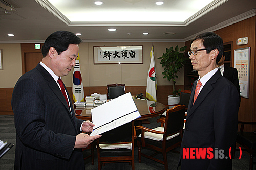 【창원=뉴시스】김해연 기자 = 경남도는 2일 경남신용보증재단 이사장으로 조문기(58·사진 오른쪽)씨를 임명했다. 신임 조 이사장은 1977년 한국은행에 입행해 한국은행 경남본부장과 골드만삭스은행 상임고문 등을 역임하는 등 금융전문가로 알려져 있다. 김두관 경남지사(사진 왼쪽)가 집무실에서 조 이사장에게 임명장을 전달하고 있다. (사진=경남도 제공)