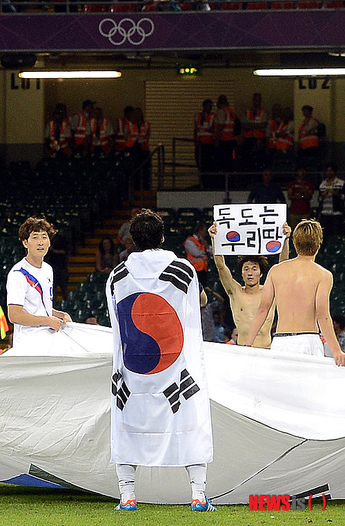【카디프(영국)=뉴시스】서재훈 기자 = 10일(현지시간) 저녁 영국 카디프 밀레니엄 스타디움에서 런던올림픽 축구 한국 축구 올림픽대표팀과 일본 대표팀과의 3-4위 결정전이 열린 가운데 대한민국이 일본을 2:0으로 완파하고 동메달을 확정, 선수들이 대형 태극기를 들고 '독도는 우리땅' 손피켓을 들어보이고 있다.