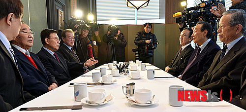 【서울=뉴시스】강진형 기자 = 지난 10일 문재인 민주통합당 대통령후보 지지를 선언한 김덕룡(왼쪽 세 번째) 민족화해협력범국민협의회 대표상임의장과 권노갑(오른쪽 두 번째) 민주통합당 상임고문이 12일 오전 서울 서초구 반포동 팔래스호텔에서 문 후보 지지를 위한 회동을 갖