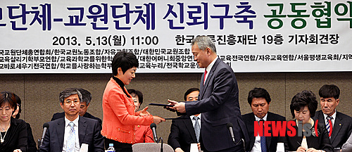 【서울=뉴시스】강진형 기자 = 안양옥(오른쪽) 한국교원단체총연합회 회장이 13일 오전 서울 중구 태평로1가 프레스센터 기자회견장에서 열린 '한국교원단체총연합회-학부모단체, 신뢰구축 공동협약 기자회견'에서 이도경 행복교육누리 공동대표와 교원과 학부모간 신뢰 증진을 약속하는 협약서를 교환하고 있다.