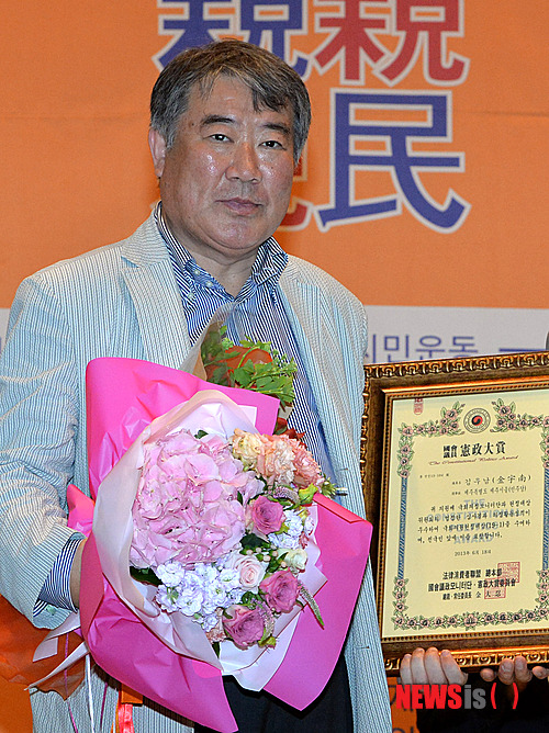【서울=뉴시스】권주훈 기자 = 270여 시민,사회단체가 함께하는우리 법률소비자연맹 총본부 국정감사 NGO 모니터단 주관단체는 19대 국회 1차년도 의정활동 평가회를 갖고 18일 오후 서울 여의도 국회 헌정기념관에서 국회의원 의장활동 종합평가 및 헌정대상 시상식에서 3선의원인 민주당 김우남 의원이 헌정대상을 수상 하고 있다. 2013.06.18.