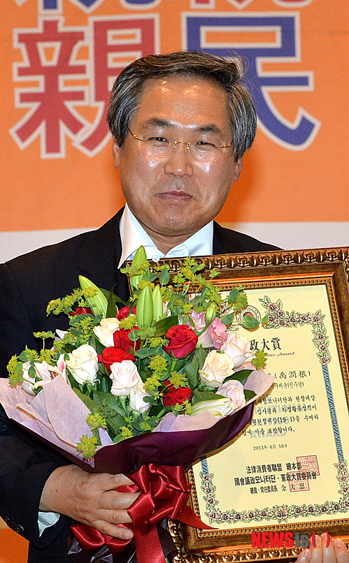 【서울=뉴시스】권주훈 기자 = 270여 시민,사회단체가 함께하는우리 법률소비자연맹 총본부 국정감사 NGO 모니터단 주관단체는 19대 국회 1차년도 의정활동 평가회를 갖고 18일 오후 서울 여의도 국회 헌정기념관에서 국회의원 의장활동 종합평가 및 헌정대상 시상식에서 3선의원인 민주당 우윤근 의원이 헌정대상을 수상 하고 있다. 2013.06.18.