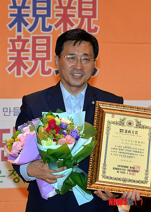【서울=뉴시스】권주훈 기자 = 270여 시민,사회단체가 함께하는우리 법률소비자연맹 총본부 국정감사 NGO 모니터단 주관단체는 19대 국회 1차년도 의정활동 평가회를 갖고 18일 오후 서울 여의도 국회 헌정기념관에서 국회의원 의장활동 종합평가 및 헌정대상 시상식에서 3선의원인 민주당 김춘진 의원이 헌정대상을 수상 하고 있다. 2013.06.18.