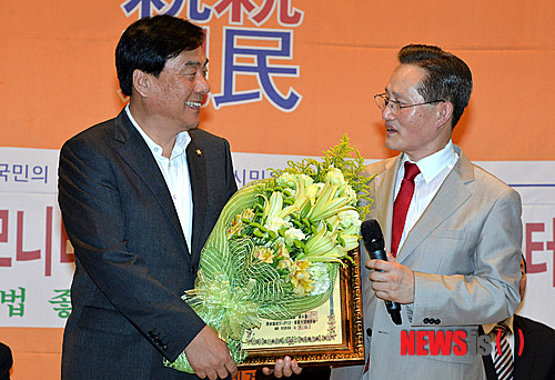 【서울=뉴시스】권주훈 기자 = 270여 시민,사회단체가 함께하는우리 법률소비자연맹 총본부 국정감사 NGO 모니터단 주관단체는 19대 국회 1차년도 의정활동 평가회를 갖고 18일 오후 서울 여의도 국회 헌정기념관에서 국회의원 의장활동 종합평가 및 헌정대상 시상식에서 3선의원인 민주당 박기춘 의원이 헌정대상을 수상 하고 있다. 2013.06.18.