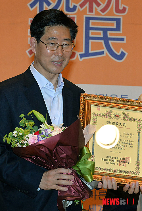 【서울=뉴시스】권주훈 기자 = 270여 시민,사회단체가 함께하는우리 법률소비자연맹 총본부 국정감사 NGO 모니터단 주관단체는 19대 국회 1차년도 의정활동 평가회를 갖고 18일 오후 서울 여의도 국회 헌정기념관에서 국회의원 의장활동 종합평가 및 헌정대상 시상식에서 3선의원인 민주당 양승조 의원이 헌정대상을 수상 하고 있다. 2013.06.18.