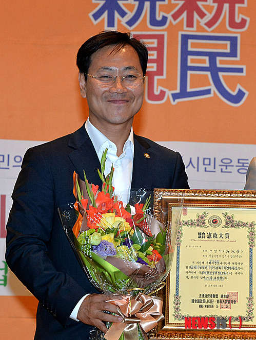 【서울=뉴시스】권주훈 기자 = 270여 시민,사회단체가 함께하는우리 법률소비자연맹 총본부 국정감사 NGO 모니터단 주관단체는 19대 국회 1차년도 의정활동 평가회를 갖고 18일 오후 서울 여의도 국회 헌정기념관에서 국회의원 의장활동 종합평가 및 헌정대상 시상식에서 3선의원인 민주당 오영식 의원이 헌정대상을 수상 하고 있다. 2013.06.18.