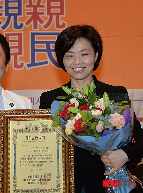 【서울=뉴시스】권주훈 기자 = 18일 오후 국회의원 의정활동 종합평가회 및 국회의원 헌정대상 시상식이 열린 서울 여의도 국회 헌정기념관 대강당에서 새누리당 민현주 의원(초선)이 헌정대상 상패를 받고 있다.