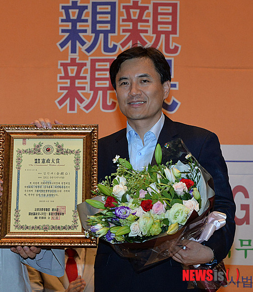 【서울=뉴시스】권주훈 기자 = 18일 오후 국회의원 의정활동 종합평가회 및 국회의원 헌정대상 시상식이 열린 서울 여의도 국회 헌정기념관 대강당에서 새누리당 김진태 의원(초선)이 헌정대상 상패를 받고 있다.