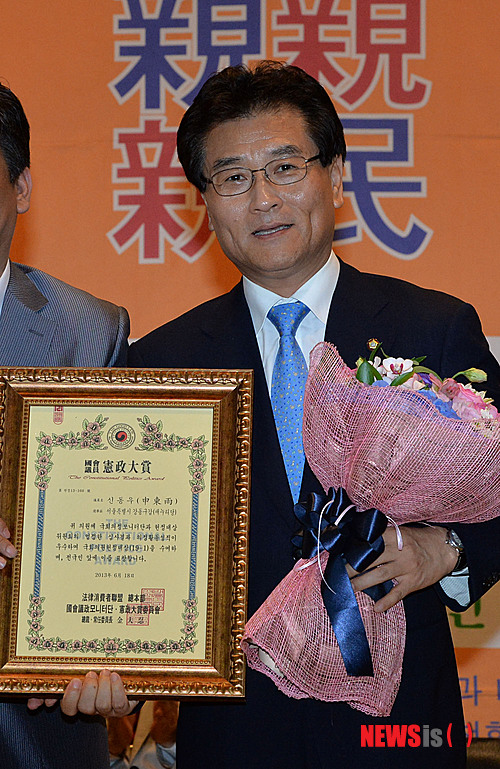 【서울=뉴시스】권주훈 기자 = 18일 오후 국회의원 의정활동 종합평가회 및 국회의원 헌정대상 시상식이 열린 서울 여의도 국회 헌정기념관 대강당에서 새누리당 신동우 의원(초선)이 헌정대상 상패를 받고 있다.