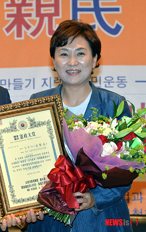 【서울=뉴시스】권주훈 기자 = 270여 시민,사회단체가 함께하는우리 법률소비자연맹 총본부 국정감사 NGO 모니터단 주관단체는 19대 국회 1차년도 의정활동 평가회를 갖고 18일 오후 서울 여의도 국회 헌정기념관에서 국회의원 의장활동 종합평가 및 헌정대상 시상식에서 재선의원인 민주당 김현미 의원이 헌정대상을 수상 하고 있다. 2013.06.18.