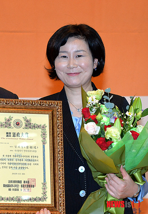 【서울=뉴시스】권주훈 기자 = 270여 시민,사회단체가 함께하는우리 법률소비자연맹 총본부 국정감사 NGO 모니터단 주관단체는 19대 국회 1차년도 의정활동 평가회를 갖고 18일 오후 서울 여의도 국회 헌정기념관에서 국회의원 의장활동 종합평가 및 헌정대상 시상식에서 재선의원인 새누리당 김희정 의원이 헌정대상을 수상 하고 있다. 2013.06.18.