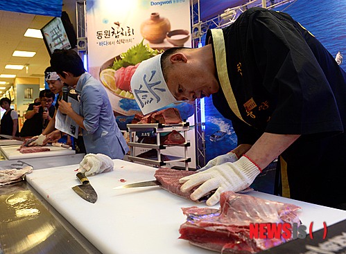 【서울=뉴시스】박주성 기자 = 25일 오전 서울 이마트 성수점에서 참치 대중화를 위해 대한민국 참치왕으로 불리는 양승호(앞쪽)씨와 일본 참치 해체 전문가인 나카가와씨, 두 한-일 참치 전문가를 초청해 고객들 앞에서 해체쇼를 하고 있다.