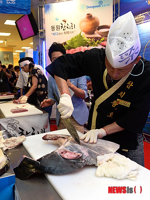 【서울=뉴시스】박주성 기자 = 25일 오전 서울 이마트 성수점에서 참치 대중화를 위해 대한민국 참치왕으로 불리는 양승호(앞쪽)씨와 일본 참치 해체 전문가인 나카가와씨, 두 한-일 참치 전문가를 초청해 고객들 앞에서 해체쇼를 하고 있다.