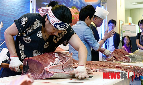 【서울=뉴시스】박주성 기자 = 25일 오전 서울 이마트 성수점에서 참치 대중화를 위해 대한민국 참치왕으로 불리는 양승호씨와 일본 참치 해체 전문가인 나카가와(왼쪽)씨, 두 한-일 참치 전문가를 초청해 고객들 앞에서 해체쇼를 하고 있다.