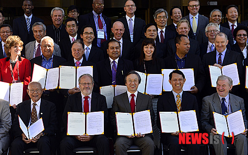 【서울=뉴시스】최동준 기자 = 고려대학교 경영대학·경영전문대학원이 '아태 경영대학장 서밋'을 개최했다. 26일 오후 서울 성북구 고려대학교 LG-POSCO경영관 앞에서 이두희(앞줄 왼쪽 세번째) 고려대 경영대학 학장을 비롯한 세계 62개 경영대학 학장들이 서밋 개최를 알리는 선언문을 들고 기념촬영을 하고 있다.