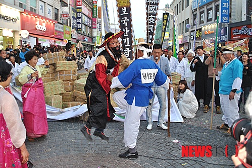 거리퍼레이드에 참여한 이평면 대표단이 동학농민혁명을 소재로 퍼포먼스를 선보였다. 전봉준 장군이 탐관오리의 상징인 고부군수 조병갑을 벌하는 장면. 2013.11.01.