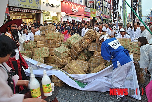거리퍼레이드에 참여한 이평면 대표단이 동학농민혁명을 소재로 퍼포먼스를 선보였다. 전봉준 장군이 동학농민혁명 당시 폐정의 상징인 만석보를 무너트리고 있는 장면. 2013.11.01.