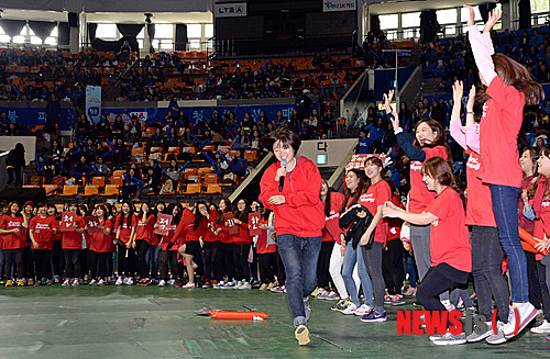 【서울=뉴시스】김진아 기자 = 5일 오후 서울 송파구 잠실동 잠실학생체육관에서 열린 숙명여대 공동체프로그램 '다이나믹 숙명'에서 학생들이 응원을 하고 있다.