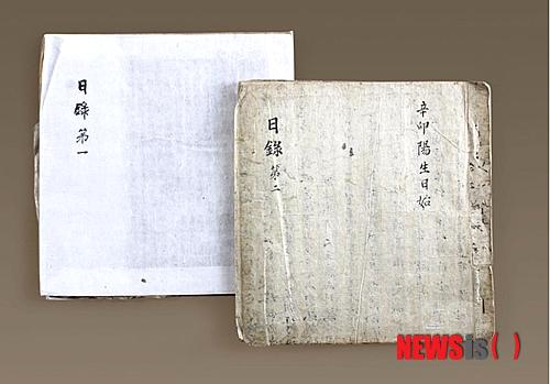 【서울=뉴시스】일본군에게 붙들려 꽃같은 청춘을 버려야 했던 위안부 할머니들이 미술치료를 받으며 그린 그림들과 상주 동학교당의 기록물, '조선의 마지막 무동(舞童)'인 故 심소(心韶) 김천흥의 전통예술 기록이 국가지정기록물로 지정된다. 상주 동학교당 부교주 김낙세의 일기.2013.12.30.(사진 = 안행부 제공)