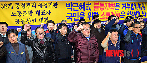 【서울=뉴시스】조종원 기자 = 23일 오후 서울 영등포구 한국노동조합총연맹에서 열린 '38개 중점관리 공공기관 노동조합 공동선언대회 기자회견'에서 정해선 민주노총 공공운수노조·연맹 위원장, 이인상 한국노총 공공연맹 위원장, 이상무 민주노총 공공연맹 위원장, 김주영 한국노총 공공노련 위원장을 비롯한 조합원들이 구호를 외치고 있다. 2014.01.23.