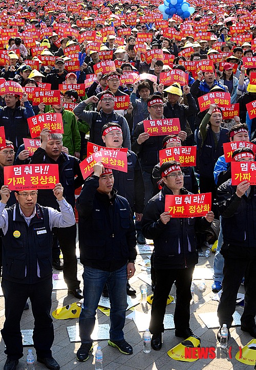 【서울=뉴시스】박찬수 기자 = 22일 오후 서울 중구 세종로 서울광장에서 양대노총 공공부문 노동조합 공동대책위원회 주최로 열린 '박근혜식 가짜 정상화 분쇄 공공노동자 결의대회'에서 참가자들이 피켓을 들고 있다.