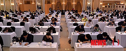 【서울=뉴시스】고범준 기자 = 27일 오전 서울 임피리얼 팰리스호텔에서 열린 '2014 제13회 한국 소믈리에 대회'에서 참가자들이 블라인드 테이스팅을 하고 있다.