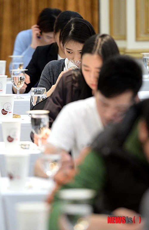 【서울=뉴시스】고범준 기자 = 27일 오전 서울 임피리얼 팰리스호텔에서 열린 '2014 제13회 한국 소믈리에 대회'에서 참가자들이 블라인드 테이스팅을 하고 있다.