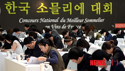 【서울=뉴시스】고범준 기자 = 27일 오전 서울 임피리얼 팰리스호텔에서 열린 '2014 제13회 한국 소믈리에 대회'에서 참가자들이 블라인드 테이스팅을 하고 있다.