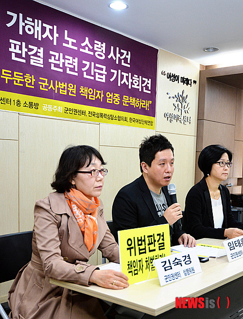 【서울=뉴시스】박문호 기자 = 14일 오전 서울 영등포구 국회대로55길 여성인권센터에서 ‘노승원 소령 성폭력 사건 판결 관련 기자회견‘이 열리고 있다. 왼쪽부터 군인권센터 김숙경 실행위원, 임태훈 소장, 김금옥 한국여성단체연합 상임대표.