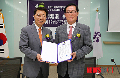 【서울=뉴시스】한국스카우트연맹(총재 함종한(오른쪽))과 굿윌스토어(송파점 대표 손만석)는 지난 14일 서울 영등포구 한국스카우트연맹 스카우트홀에서 청소년의 바른성장을 위한 나눔 실천과 장애인 일자리 창출을 돕기 위한 업무협약(MOU)을 체결하고 포즈를 취하고 있다. 2014.05.15. (사진=한국스카우트연맹 제공)