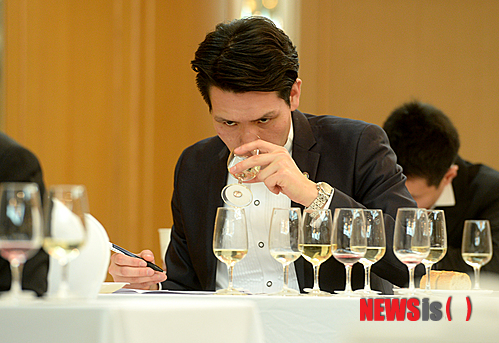 【서울=뉴시스】박상훈 기자 = 21일 오전 서울 강남구 논현동 임피리얼 팰리스에서 열린 '제13회 한국 소믈리에 대회'에서 참가자들이 블라인드 테이스팅을 하고 있다.