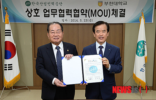 【서울=뉴시스】한국산업인력공단(이사장 송영중)이 23일 서울 영등포구 한국산업인력공단 서울남부지사에서 부천대학교(총장 한방교)와 국가인적자원개발에 관한 연구 및 인재양성을 위한 상호 업무협약을 체결했다. 송영중(오른쪽) 이사장과 한방교 총장이 기념촬영을 하고 있다. 2014.05.23. (사진=한국산업인력공단 제공)