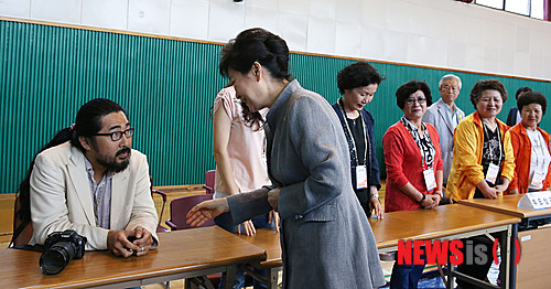【서울=뉴시스】홍찬선 기자 = 박근혜 대통령이 전국동시지방선거일인 4일 오전 서울 종로구 청운동 서울농학교에 마련된 청운·효자 제1투표소를 방문해 투표참관인으로 참석한 김한울 노동당 종로·중구 당원협의회 사무국장에게 악수를 권하자 거부하고 있다. 김 사무국장은 뉴시스와 전화 인터뷰에서 지난 5월 9일 세월호 유가족들이 청와대 앞에서 박 대통령과의 면담을 요청했을때 박 대통령의 진심어린 행동이 보이지 않아 악수를 거부했다고 밝혔다. 2014.06.04.