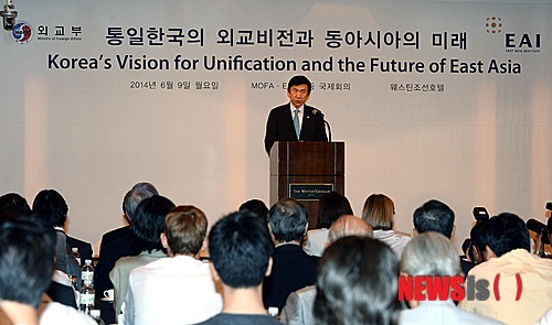【서울=뉴시스】박찬수 기자 = 윤병세 외교부 장관이 9일 오전 서울 중구 소공동 웨스틴조선호텔에서 외교부와 동아시아연구원(EAI) 공동주최로 열린 '통일한국의 외교비전과 동아시아의 미래' 국제회의에서 기조연설을 하고 있다.