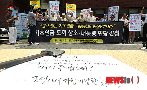 이들은 기자회견에서 "하위 70% 노인에게 최고 20만원의 기초연금이 지급되지만, 가장 가난한 기초생활 수급자 노인에게는 기초생활보장 생계급여에서 20만원을 빼버리니 아무 혜택이 없는 것"이라고 주장했다. 2014.07.01.