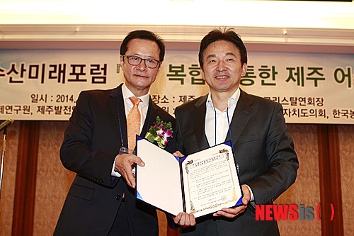 【서울=뉴시스】수협중앙회(회장 이종구)와 제주발전연구원이 30일 제주 그랜드호텔에서 ‘융복합화를 통한 제주 어촌의 미래화’ 라는 주제로 제7회 수산미래포럼을 공동 개최한 가운데 임병기(왼쪽) 한국농어촌사랑방송예술인공동체 이사장이 원희룡 제주특별자치도지사에게 해녀문화 융성을 위한 희망 메시지를 전달한 뒤 기념촬영을 하고 있다. 2014.09.30. (사진=수협중앙회 제공)