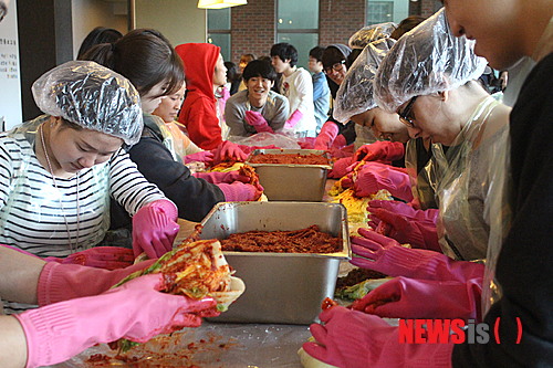 【포항=뉴시스】강진구 기자 = 경북 포항의 한동대학교(총장 장순흥) 학생들은 6일 오전 학생회관에서 ‘사랑의 김장 나누기’ 행사를 가졌다.이날 행사는 한동대 제19대 총학생회(회장 박사훈)와 ‘누리봄 봉사 단체 협의회’가 마련했다.이번 행사에는 50여명의 학생들이 참여했으며 이날 담근 400포기 김장김치는 포항시 노인복지회관과 포항시 독거노인들에게 전달될 예정이다.2014.11.07. (사진=한동대학교 제공)