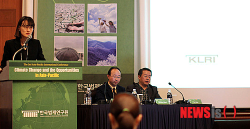 【서울=뉴시스】20일 서울 강남구 르네상스호텔에서 열린 '아시아 태평양 지역의 기후변화와 기회'(Climate Change and the Opportunities in Asia-Pacific)를 주제로 열린 국제학술회의에 참석한 한국법제연구원 김은정 부연구위원이 제2세션에서 발제를 하고 있다. 2014.11.20. (사진=한국법제연구원 제공)