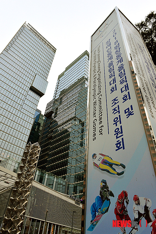 【서울=뉴시스】강진형 기자 = 일본 아사히신문이 인터넷판을 통해 ‘IOC가 평창동계올림픽 썰매 종목의 해외 개최를 조직위원회 측에 통보했다’고 보도한 7일 오후 서울 종로구 평창동계올림픽대회 조직위원회 서울사무소 앞에 입간판이 보이고 있다.