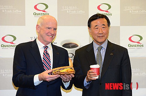 【서울=뉴시스】김진아 기자 = 11일 오후 서울 중구 서울스퀘어에서 열린 '퀴즈노즈 글로벌 CEO 방한 기자간담회'에서 스튜어트 매티스(Stuart Mathis, 왼쪽) 퀴즈노스 글로벌 CEO와 김영덕 유썸 퀴즈노스 코리아 대표이사가 포토타임을 갖고 있다.