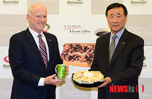 【서울=뉴시스】김진아 기자 = 11일 오후 서울 중구 서울스퀘어에서 열린 '퀴즈노즈 글로벌 CEO 방한 기자간담회'에서 스튜어트 매티스(Stuart Mathis, 왼쪽) 퀴즈노스 글로벌 CEO와 김영덕 유썸 퀴즈노스 코리아 대표이사가 포토타임을 갖고 있다.