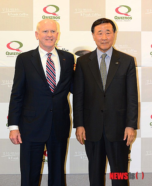 【서울=뉴시스】김진아 기자 = 11일 오후 서울 중구 서울스퀘어에서 열린 '퀴즈노즈 글로벌 CEO 방한 기자간담회'에서 스튜어트 매티스(Stuart Mathis, 왼쪽) 퀴즈노스 글로벌 CEO와 김영덕 유썸 퀴즈노스 코리아 대표이사가 포토타임을 갖고 있다.