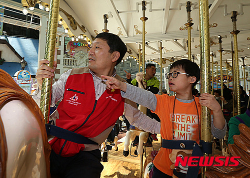 【서울=뉴시스】장애인의 날을 사흘 앞둔 17일 서울 송파구 롯데월드 어드벤처(대표 박동기)가 마련한 ‘愛너지 나눔’ 초청행사에서 박동기 대표가 지적장애 아동과 놀이기구를 이용하고 있다.