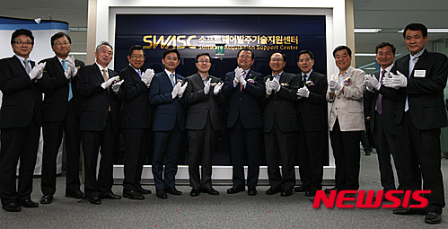 【서울=뉴시스】최재유 미래창조과학부 제2차관이 27일 오후 서울 마포구 누리꿈스퀘어 연구개발타워에서 열린 '소프트웨어발주기술지원센터 개소식'에 참석해 현판제막을 마치고 기념촬영 하고 있다.